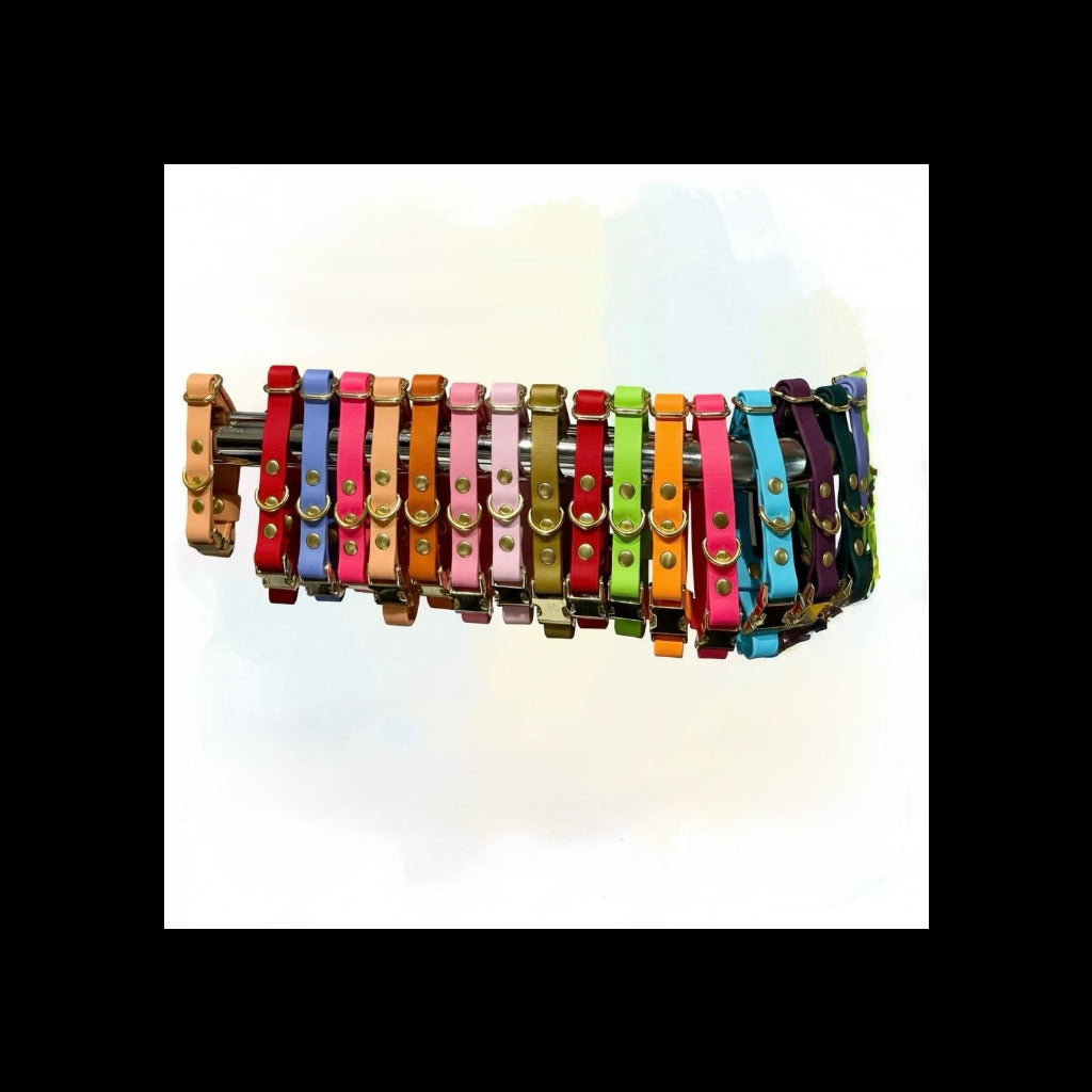Colorful Click Collars. Engravable Brass Hardware, Waterproof, Bright Colored Vegan Leather Material