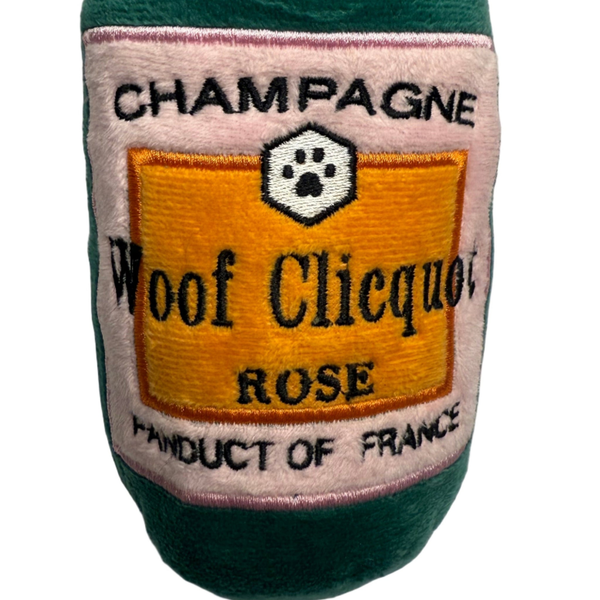 - The Veuve Parody Plush Dog Toy: Time for some bubbles with your furry friend by treating them to our Woof Clicquot Rose' dog toy, featuring a dark green velvety exterior with a built-in squeaker hidden inside. It’s a playful, cute interactive dog toy that combines style & fun. The large size features a durable fuse mesh lining that is suitable for aggressive squeakers. Size 11"x5"x3.5".